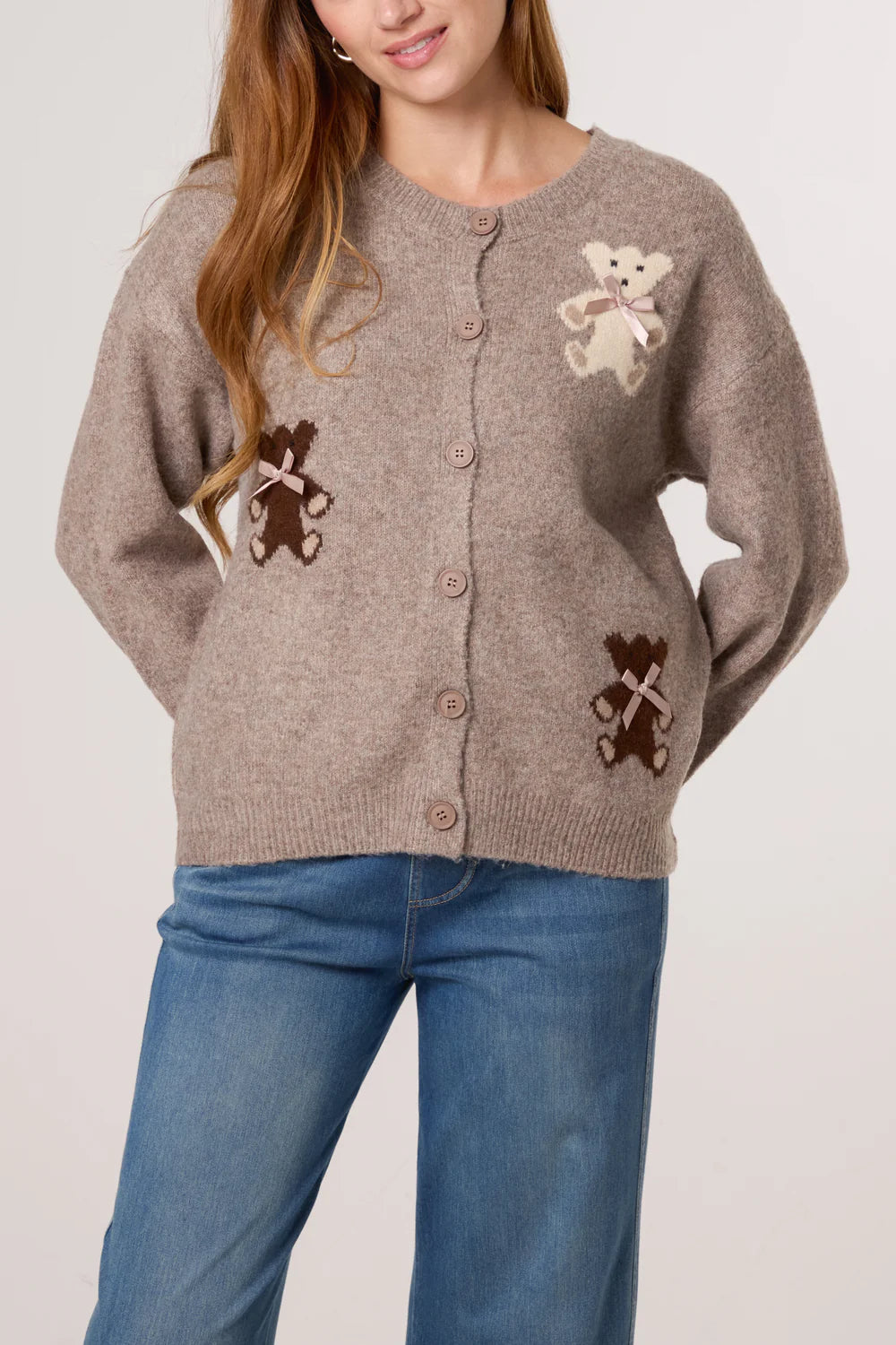 Beautiful wool blend bear & bow knitted button down cardigan. 65% Polyester, 3% Elastane, 13% Acrylic, 13% Nylon, 6% Wool