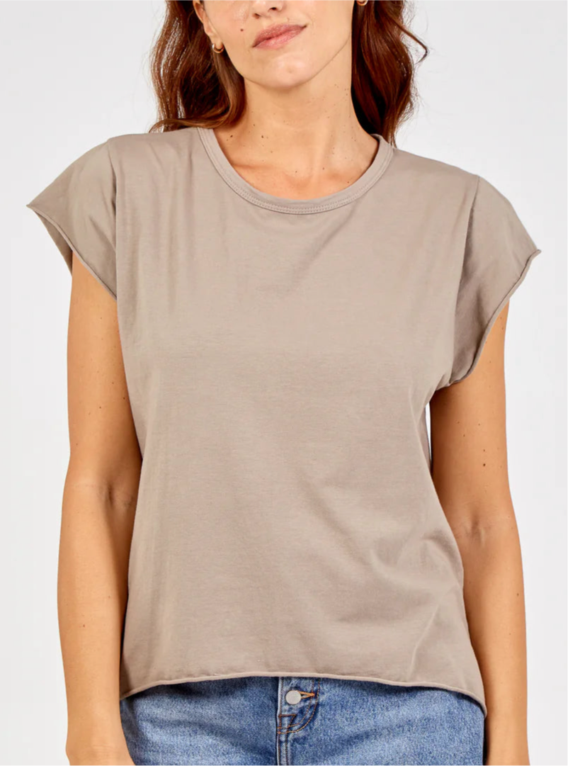 Mocha top with rolled edge and cap sleeves. One size (8-16). 95% cotton 5% elastane.