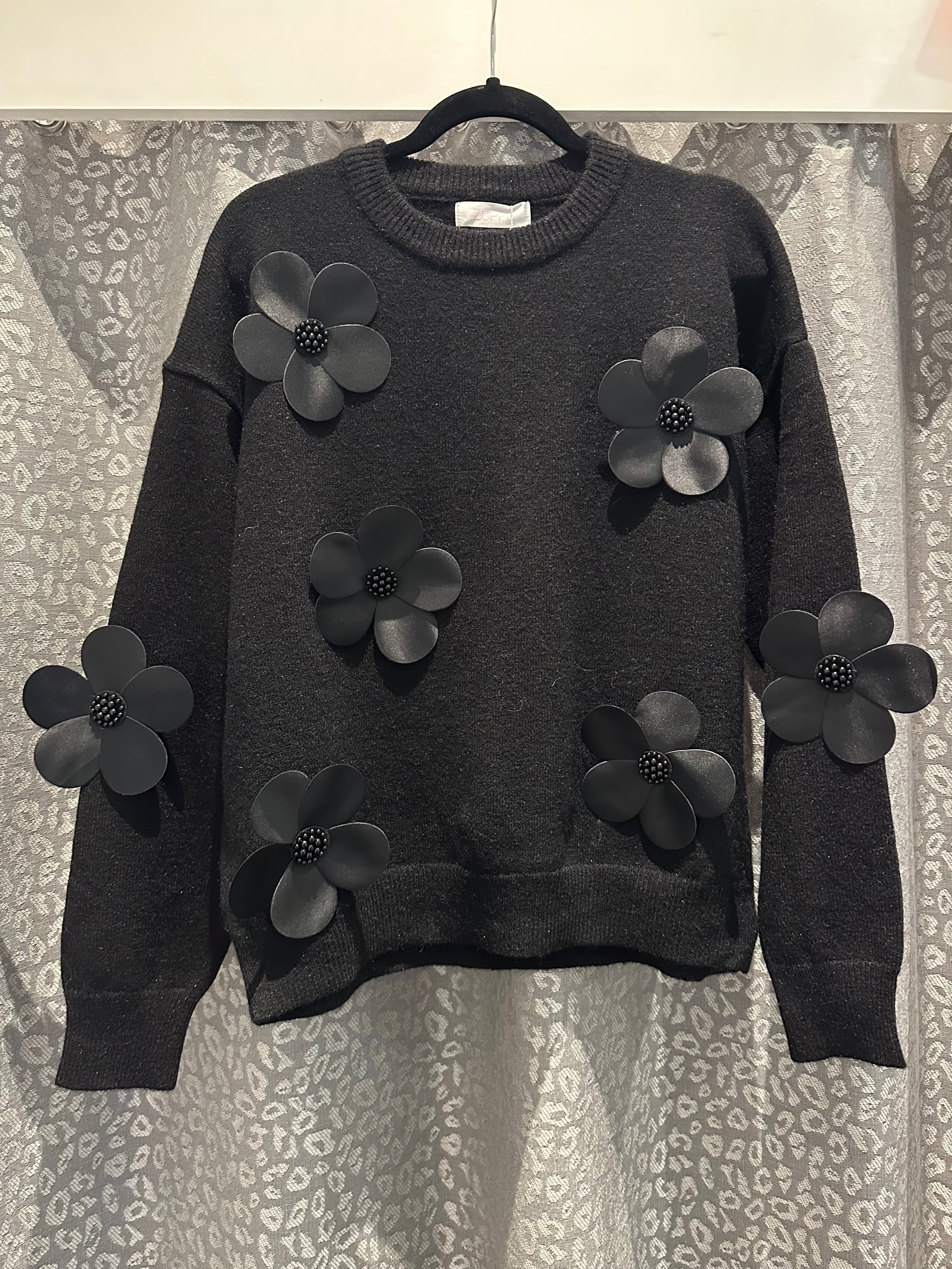 A slouch fit super soft knitted long sleeved round neck jumper with embellished satin petal flower body and sleeve detail. One size.