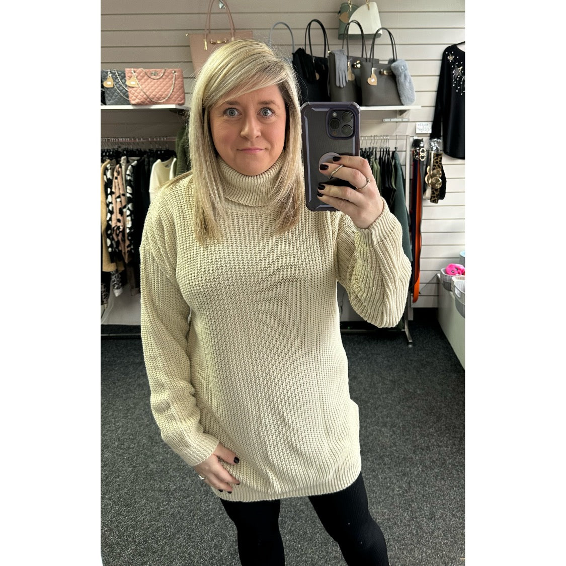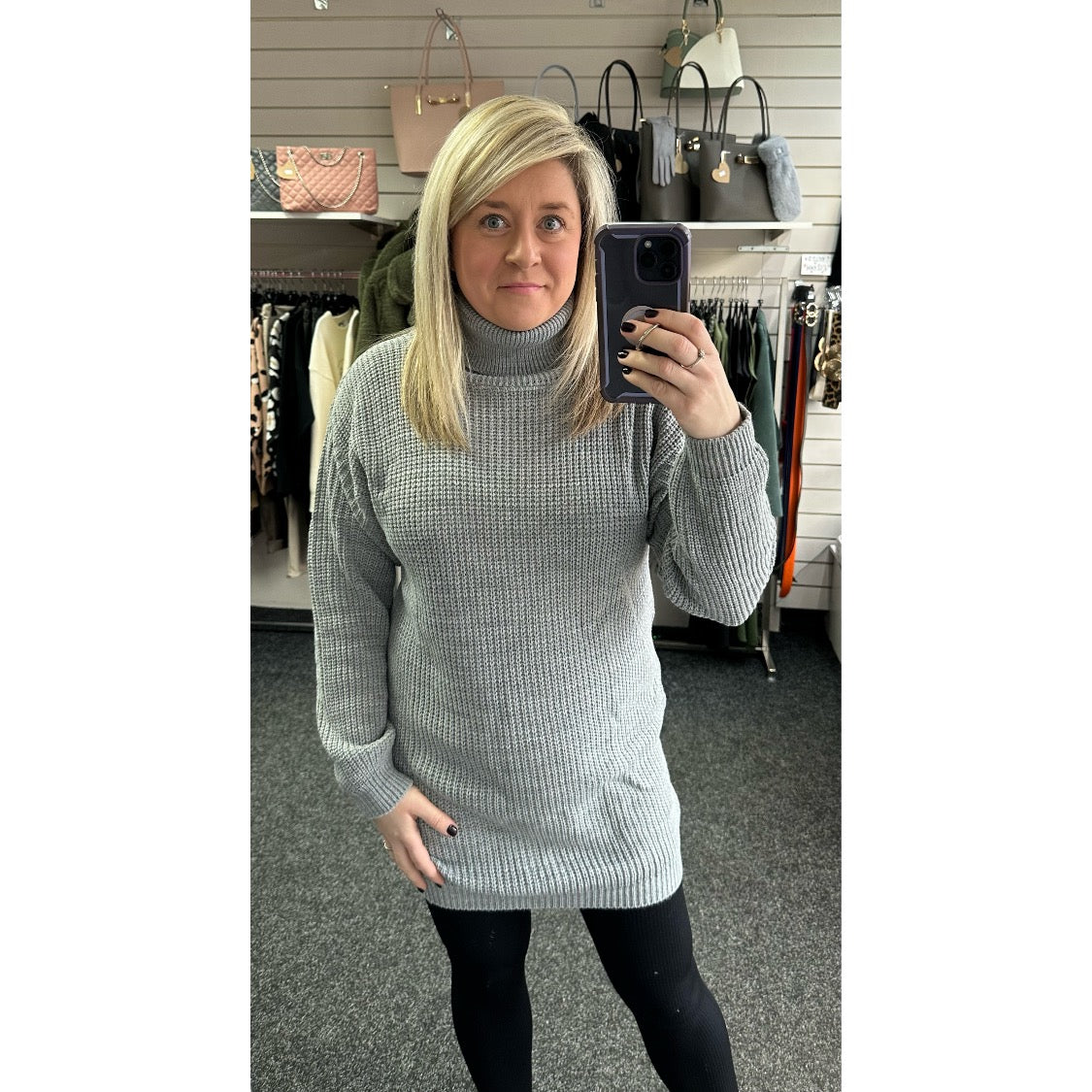 Super cosy roll neck knitted dress. Available in grey, mocha, stone, black and cream.