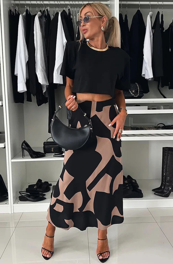 Beautiful brown/black print maxi skirt. Made in Italy from 100% polyester. Light and floaty stretchy satin fabric. Elasticated waist. Length approx 35" (89cm)