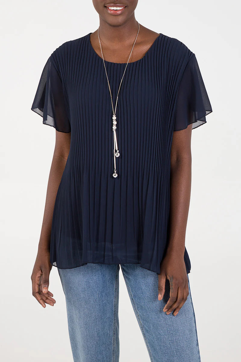 Elevate your wardrobe with our lovely black pleated top, complete with a complimentary necklace. Versatile and stylish, this one-size top fits sizes 8-16.